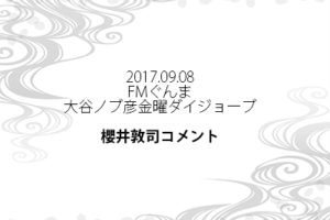 FM群馬大谷ノブ彦金曜ダイジョーブをお聞きの皆さん、大谷さん、こぐれさんこんばんは。バクチクのボーカル櫻井です。 群馬はまあ、みなさん、ご存知の方はいらっしゃると思うんですけどもバクチク、メンバー全員の出身地でもあります…